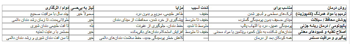 جدول مقایسه درمانهای خرد شدن دندان شیری