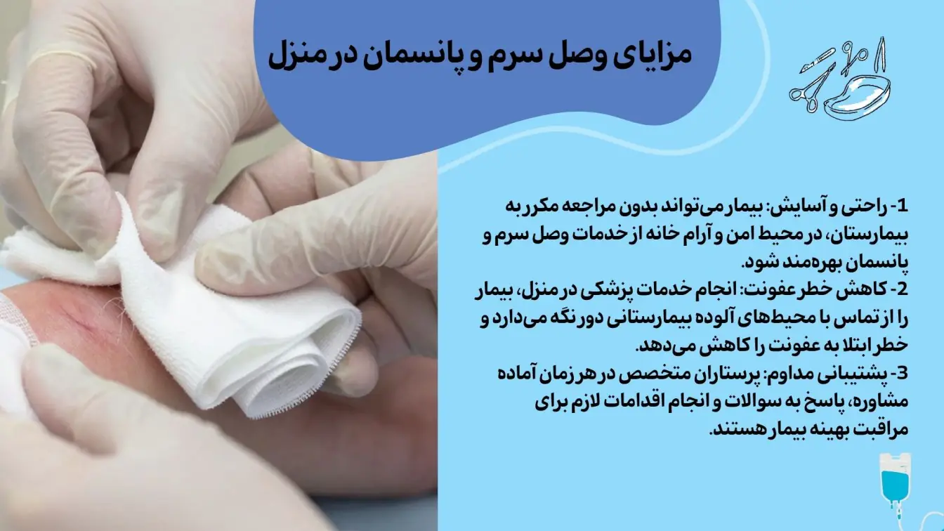 - کاهش خطر عفونت: انجام خدمات پانسمان و وصل سرم در منزل به کاهش خطر عفونتهای بیمارستانی کمک میکند، چرا که بیمار در محیط آشنای خود و تحت نظارت پرستار متخصص درمان میشود.